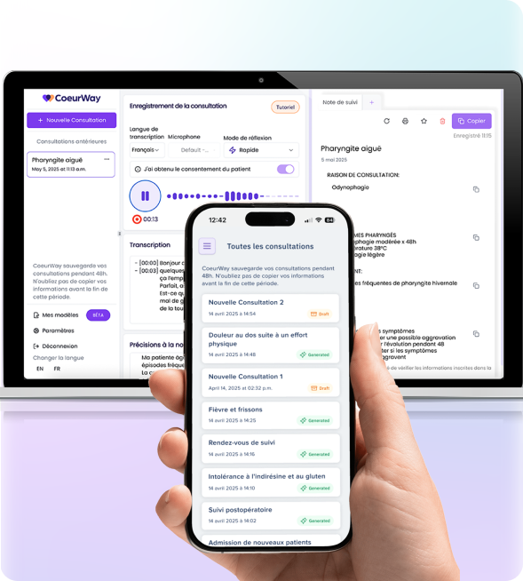 CoeurWay utilise le micro intégré de vos appareils, sans nécessiter de téléchargement : tout se passe en ligne. Son utilisation est simple : obtenir le consentement du patient, enregistrer la rencontre, générer la note, la valider, puis la copier dans le DME.